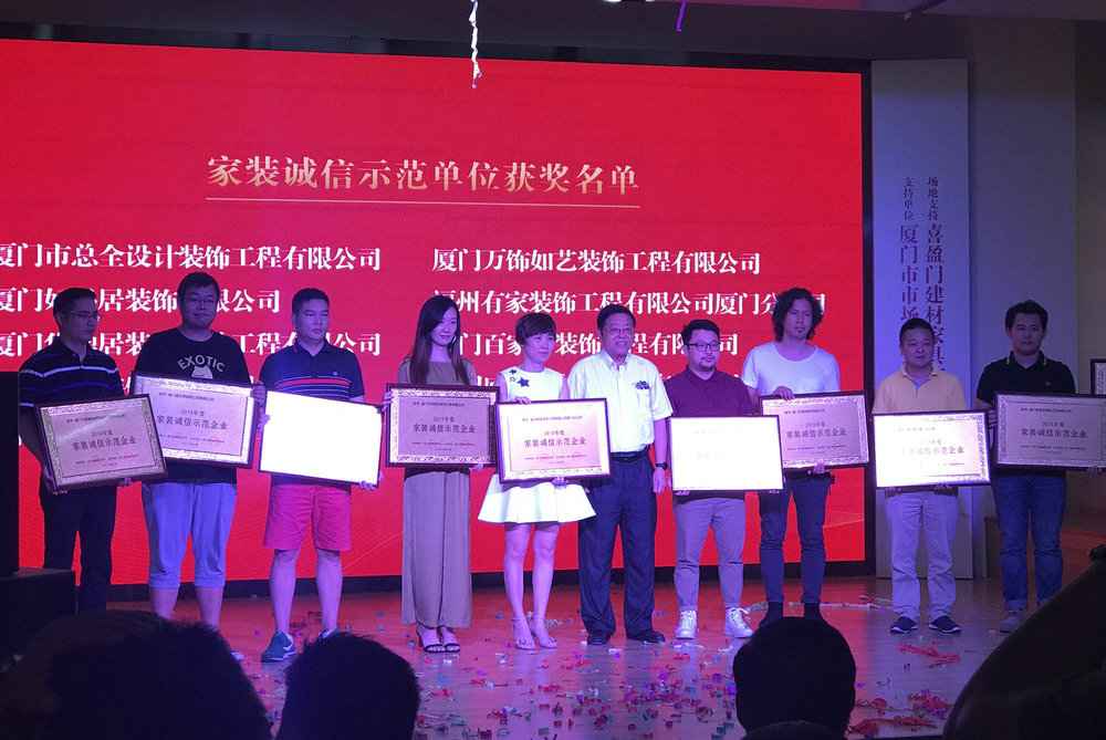 由廈門市室內(nèi)裝飾協(xié)會主辦的2018年度家裝誠信示范企業(yè)于2018年8月28日在集美喜盈門建材家居廣場負一樓舉行誠信示范企業(yè)百名誠信設計師授牌儀式。(主辦單位:廈門室內(nèi)裝飾協(xié)會。指導單位:廈門市誠信促進會。支持單位:廈門市市場協(xié)會。場地支持:喜盈門建材家居廣場)